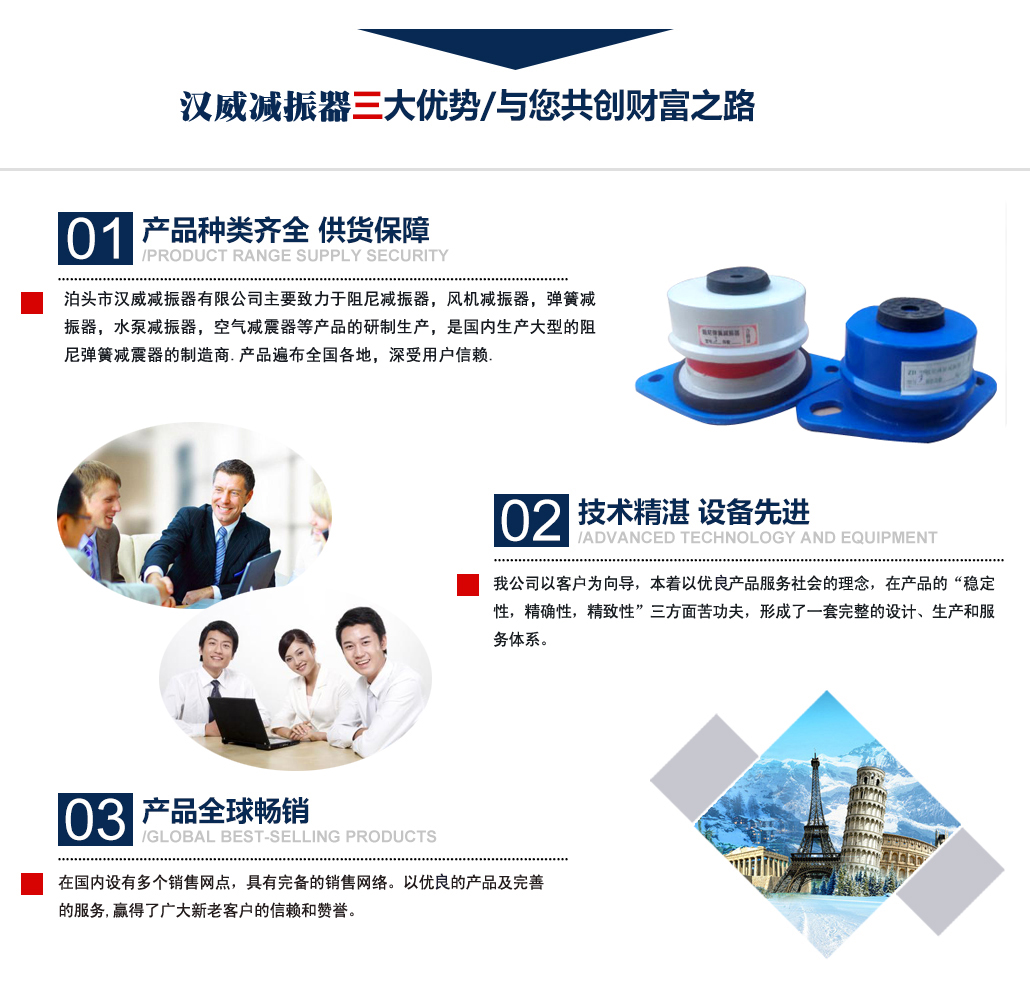 ?泊頭市漢威減振器有限公司主要致力于阻尼減振器,風機減振器,彈簧減振器,水泵減振器,空氣減震器等產(chǎn)品的研制生產(chǎn),是國內(nèi)生產(chǎn)阻尼彈簧減震器的制造商,產(chǎn)品廣泛用于中央空調、通風管道、鋼鐵、發(fā)電、石化、水泥和城市供熱等行業(yè)的各類管道和設備上,并在全國多地工程上得到應用,業(yè)績遍布全國多地,深受用戶信賴. 公司主要減振器系列產(chǎn)品有:中央空調系列減振器、泵房系列減振器、管道系列減振器、風機系列減振器、以及自行設計制作的系列隔振臺座。泊頭市漢威減震器科技有限公司擁有多名高素質技術人員,擁有完善的阻尼彈簧減震器生產(chǎn)和檢驗專用設備,擁有硅橡膠自動擠出生產(chǎn)線,全自動彈簧機等設備。生產(chǎn)條件逐漸完善進步,努力擴大生產(chǎn)規(guī)模,提高泊頭市減震器科技有限公司的生產(chǎn)競爭力。 多年來漢威減振器以三誠作為公司的字號,旨在立足當前......